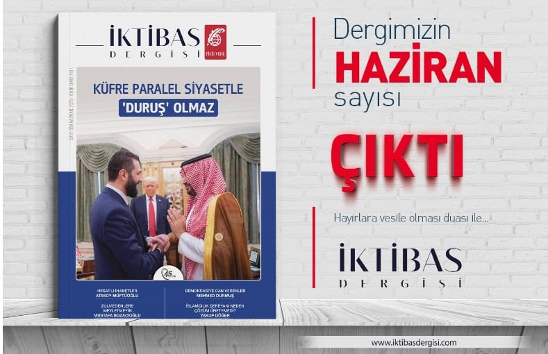 1981’den bu yana yayın hayatını sürdüren İktibas Dergisi’nin 2025 yılı Haziran sayısı, 558. sayı olarak bugün itibariyle okurlarıyla buluştu. Derginin bu ayki gündemi, Mayıs ayının başat meselesi haline dönüşen Suriye’deki dönüşüm oldu. Trump’ın Şara’yı Selman’la birlikte kabul etmesi yanında, ayın son günlerinde Amerikan bayrağının Şam’da Suriye Dışişleri Bakanı ve ABD’nin Ankara Büyükelçisi tarafından göndere çekilmesi, ülkedeki dönüşümün artık açıktan yürütüleceğinin de habercisiydi.